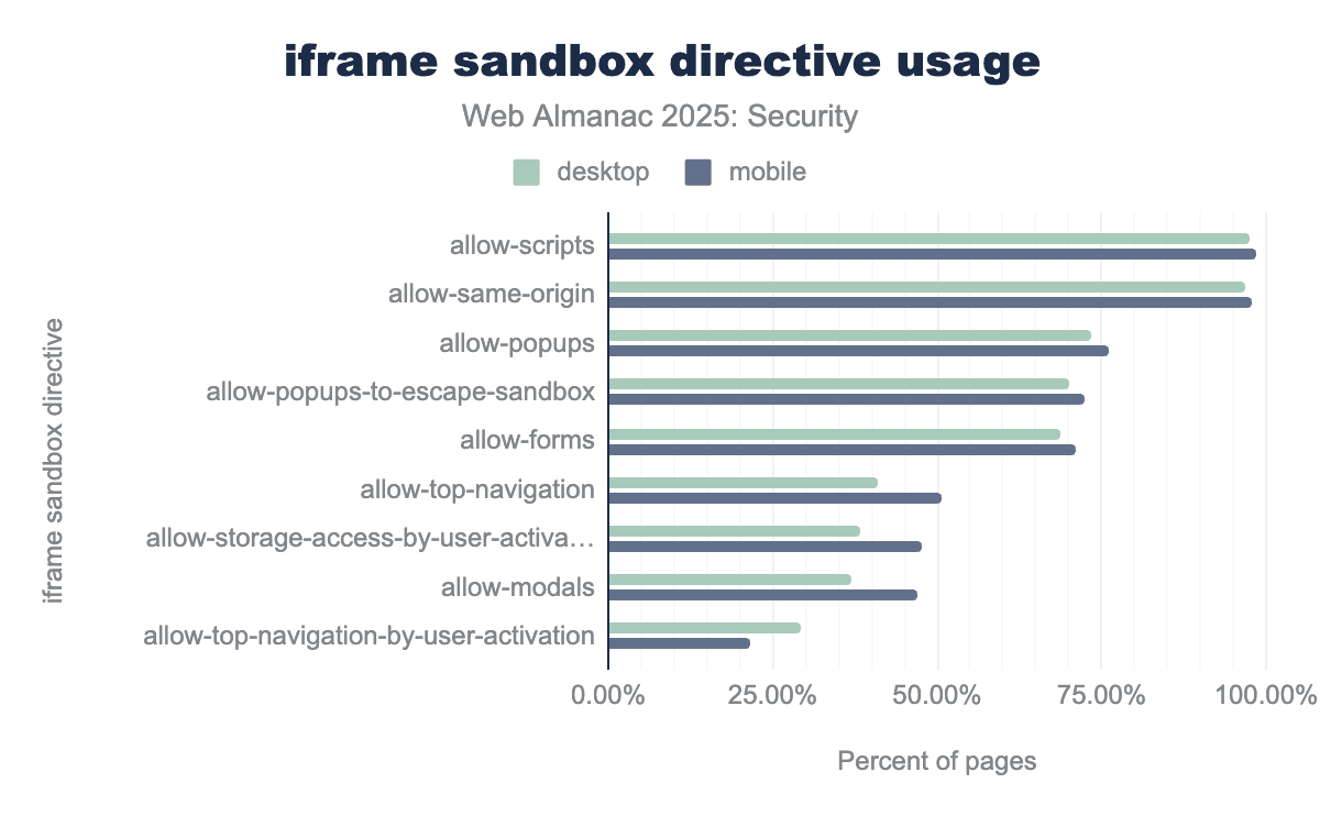 We find that over 2% of mobile pages setting a CSP policy via a <meta> tag include the frame-ancestors directive and 0.003% include the sandbox directive. The latter boils down to only three pages out of the entire crawled dataset. Compared to last edition, the misconfiguration of frame-ancestors shows up on 600 more pages, thereby rising by over 0.8%. This represents a slow but negative evolution for these types of misconfigurations.