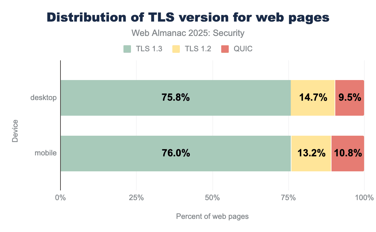 Like in the 2024 edition of the Web Almanac, we find that both QUIC and TLS1.3 see an increase in use. Again we can assume that some sites using TLS1.2 have moved to TLS1.3 and some sites that were using TLS1.2 or TLS1.3 have moved to QUIC. TLS1.2 decreased by another 4.5% this year. We can see that the adoption of QUIC has slowed down a bit this year, with the share of sites using QUIC only rising by 0.8%. In the future, it can be expected that TLS1.2 will slowly phase out over (a long) time and QUIC will continue rising.