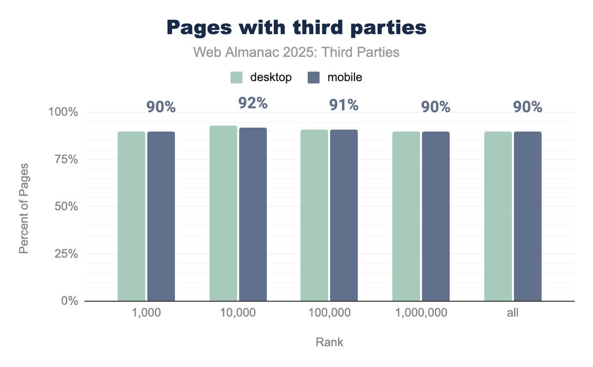 Compared to the previous year, we observe a slight decrease in the percentage of pages that use one or more third parties across websites. However, despite this decrease, the percentage of pages with one or more third parties remains greater or equal to 90%.