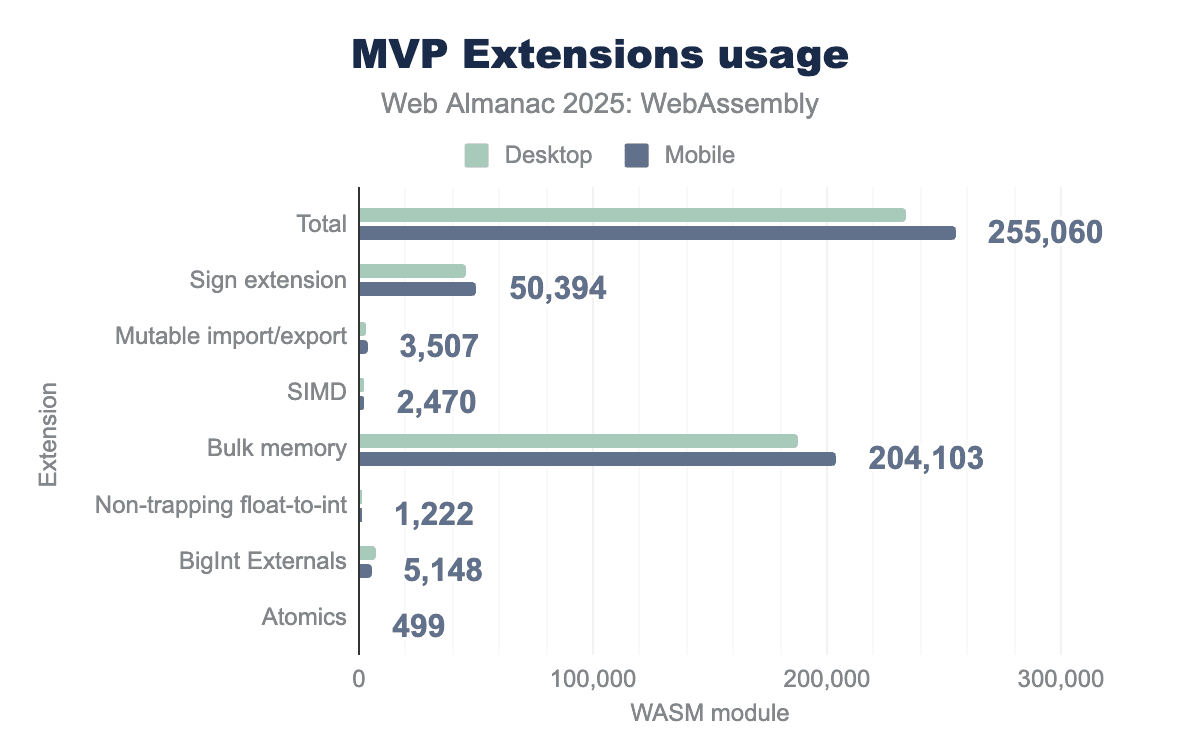 With respect to the total extension usage in year 2021, It is observed that total extension usage in 2025 drastically ~61 times more on desktop clients and ~80 times more on mobile based clients. To make the usage of very complex tasks, the WebAssembly, We have marked the Bulk Memory stats are increased to 8936 times higher on desktop and 25,512 times higher on mobile clients with respect to year 2021 stats.