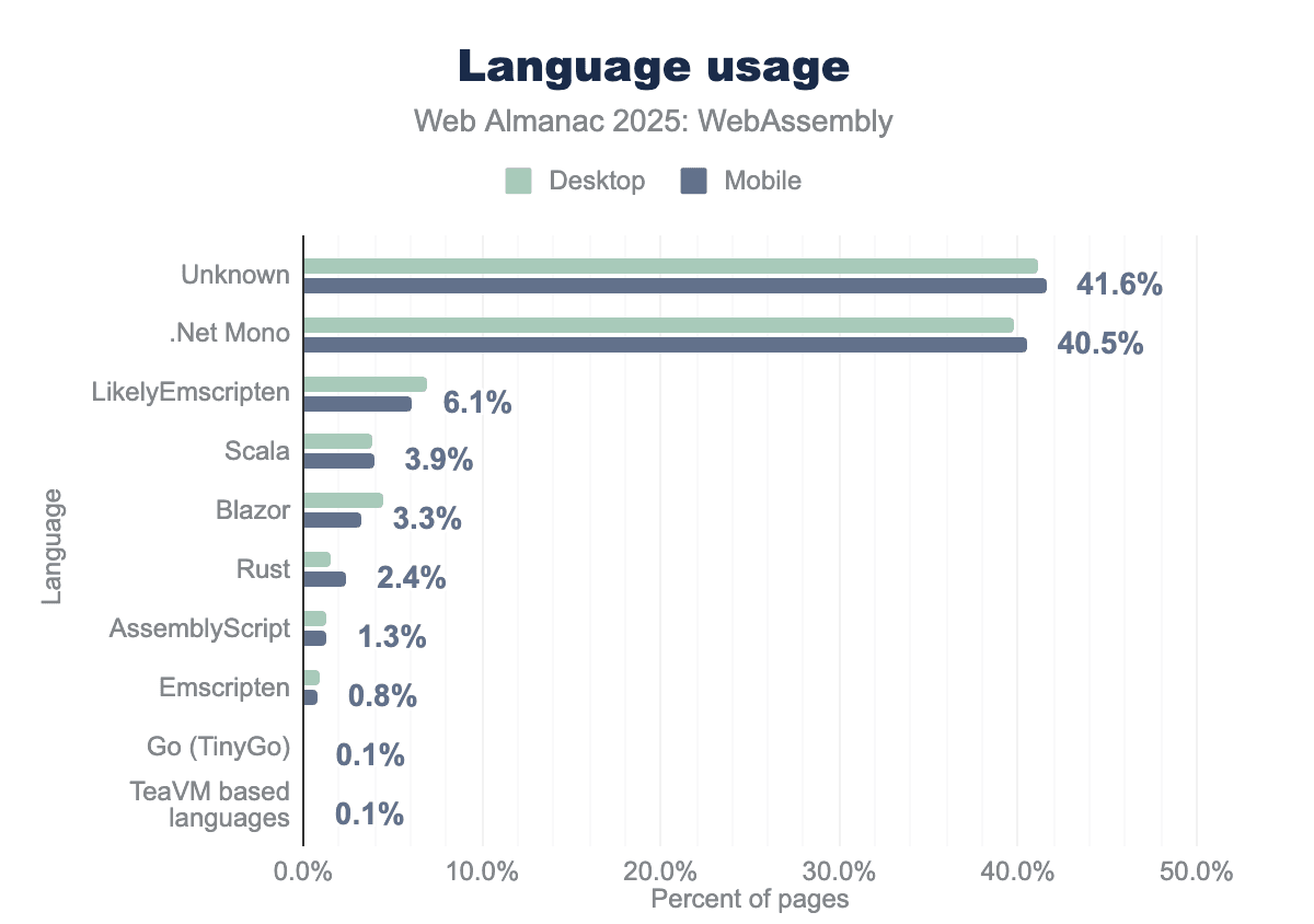 We have found the .Net / Mono eco system based languages (including Blazor) reserves the first position for the language used in WebAssembly for desktop clients with 40.5% and for mobile clients with 39.8%